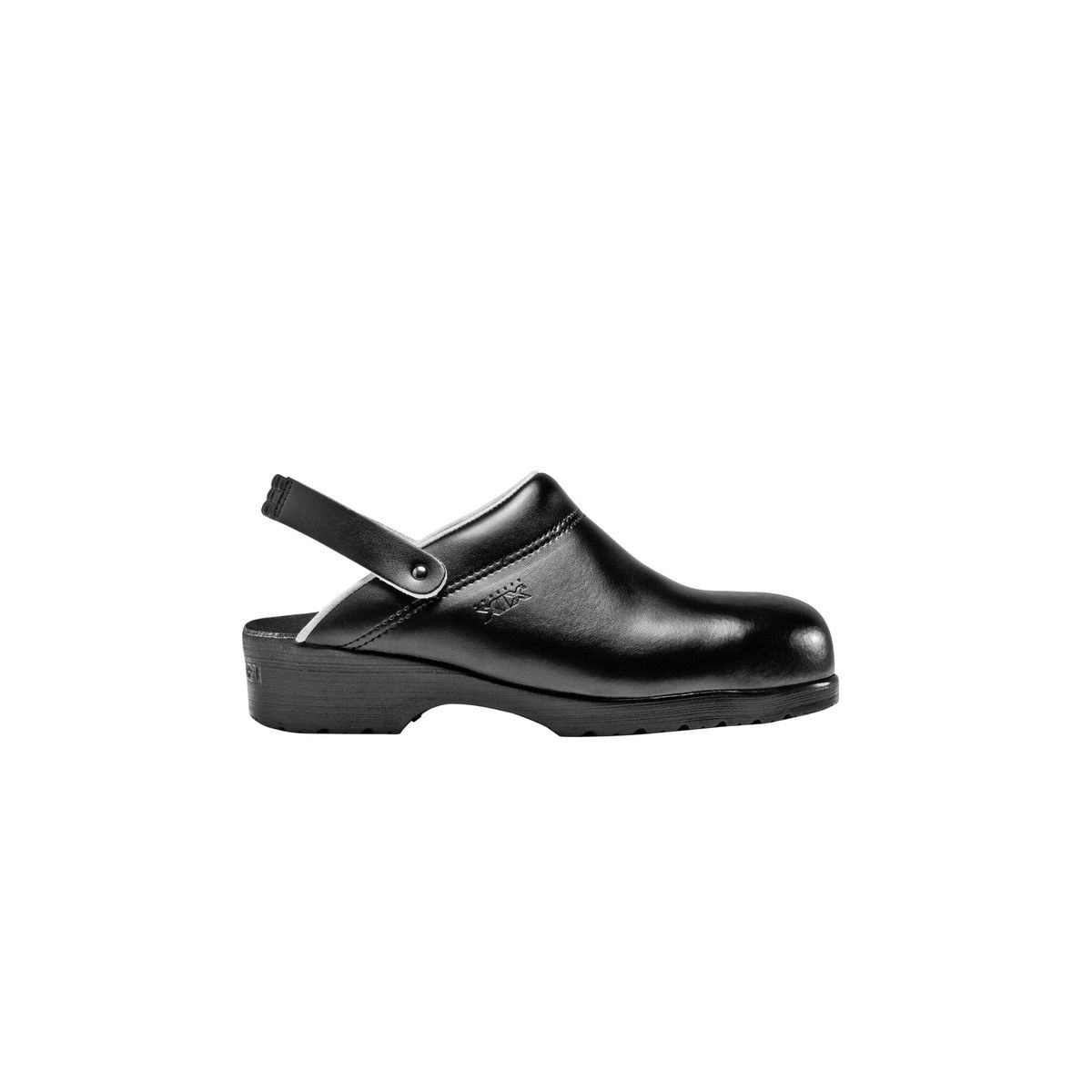 Sabot antinfortunistico con punta di sicurezza in acciaio e stringa elastica sul tallone. Tomaia in pelle, fori di areazione sul lato interno, suola antiscivolo ADHERA. -