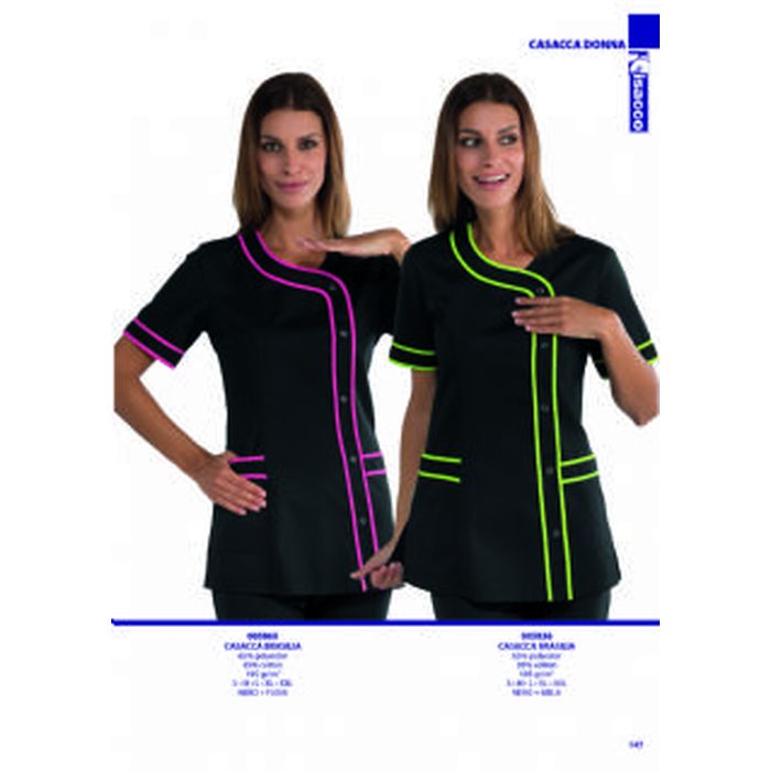 Casacca donna, modello con ottima vestibilita' e linea leggermente sancrata, bottoni a pressione, manica corta tessuto 65% poliestere 35% cotone, 195 gr/m²