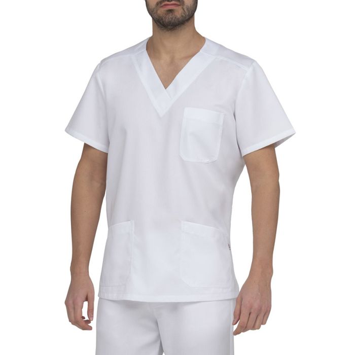 Casacca Giuliano manica corta, collo a V, due tasche, taschino sul petto, spacchetti laterali