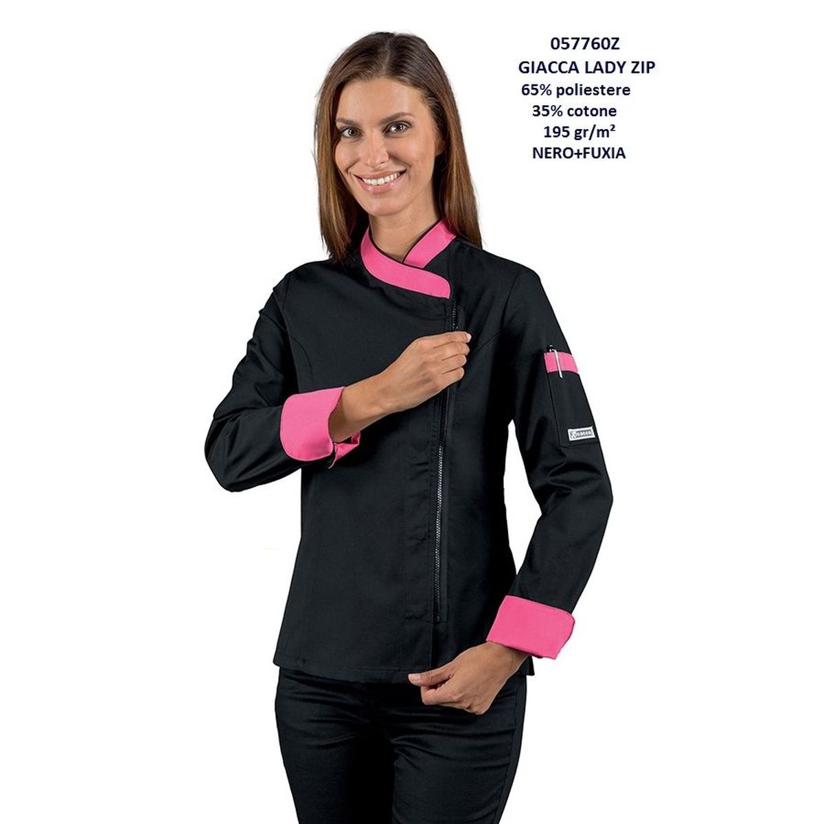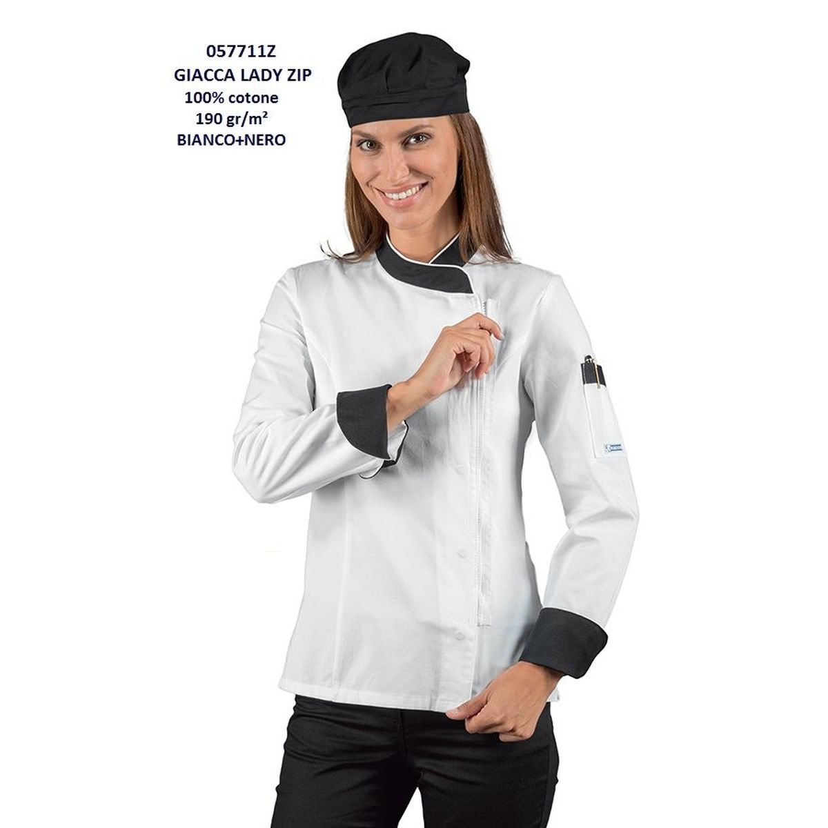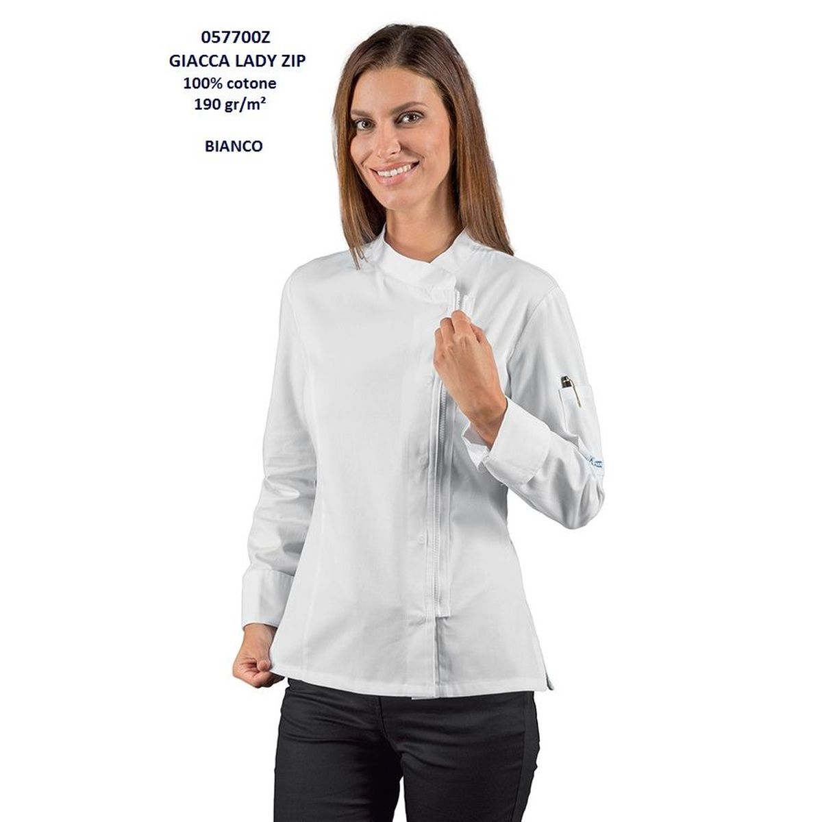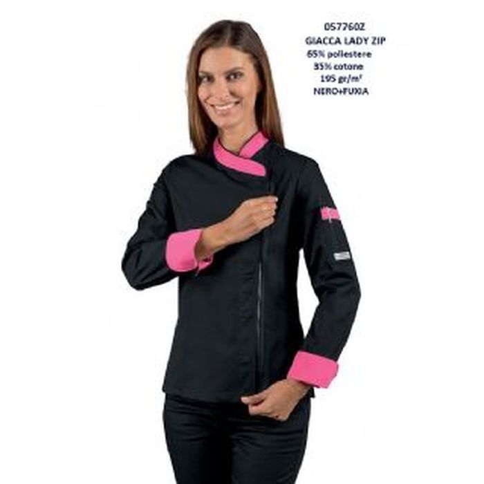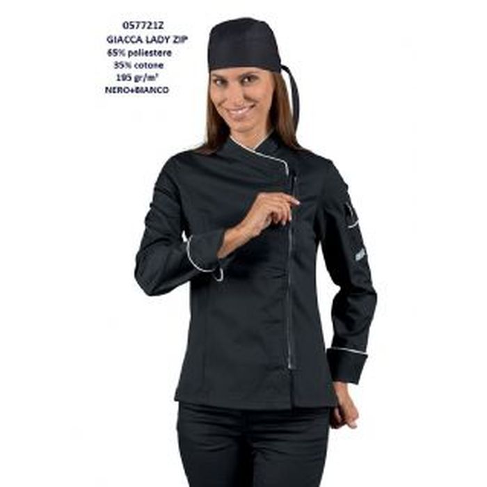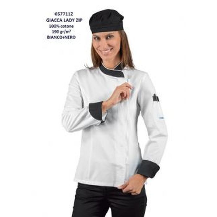 Giacca cuoco donna Zip, manica lunga,modello sancrato con bottoni a pressione e chiusura a cerniera zip,