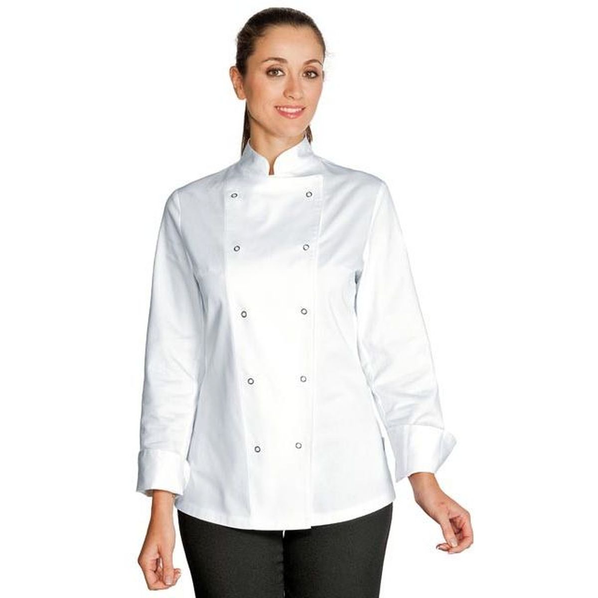 - Giacca cuoco, modello esclusivamente femminile, bottoni a pressione in vista, - tessuto 100% cotone, peso 190 gr/mq - colore bianco, linea sancrata. - - Abbinabile agli altri articoli della fantasia Bianco. -