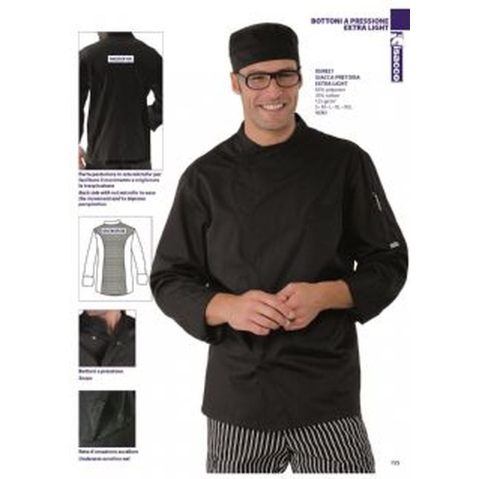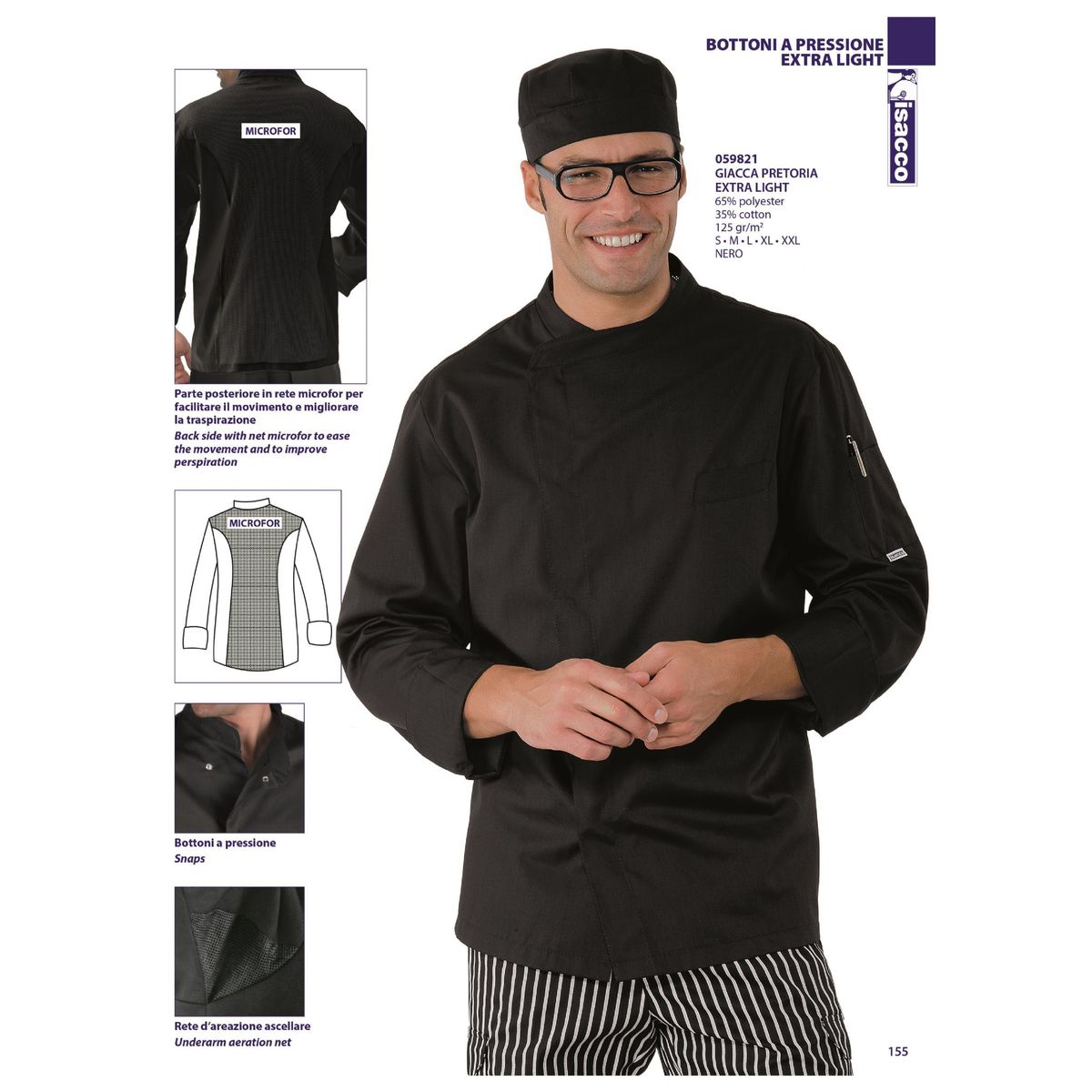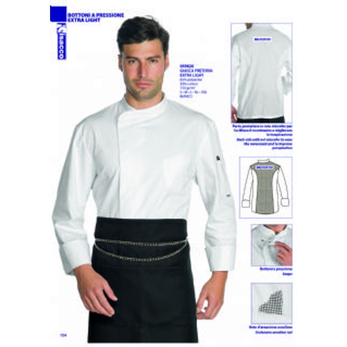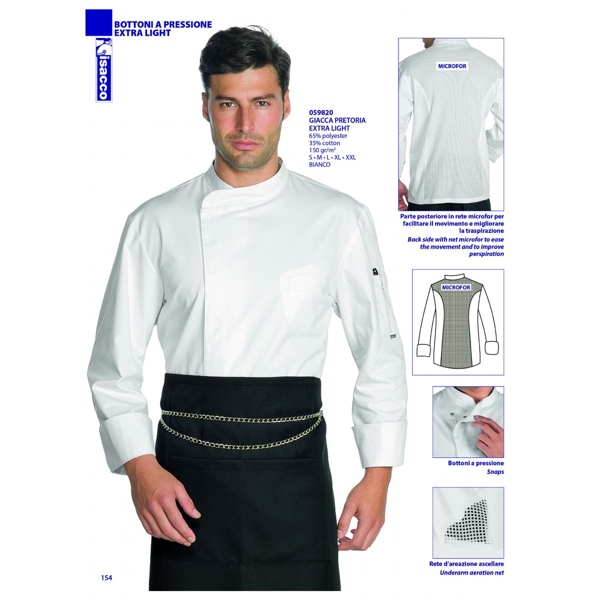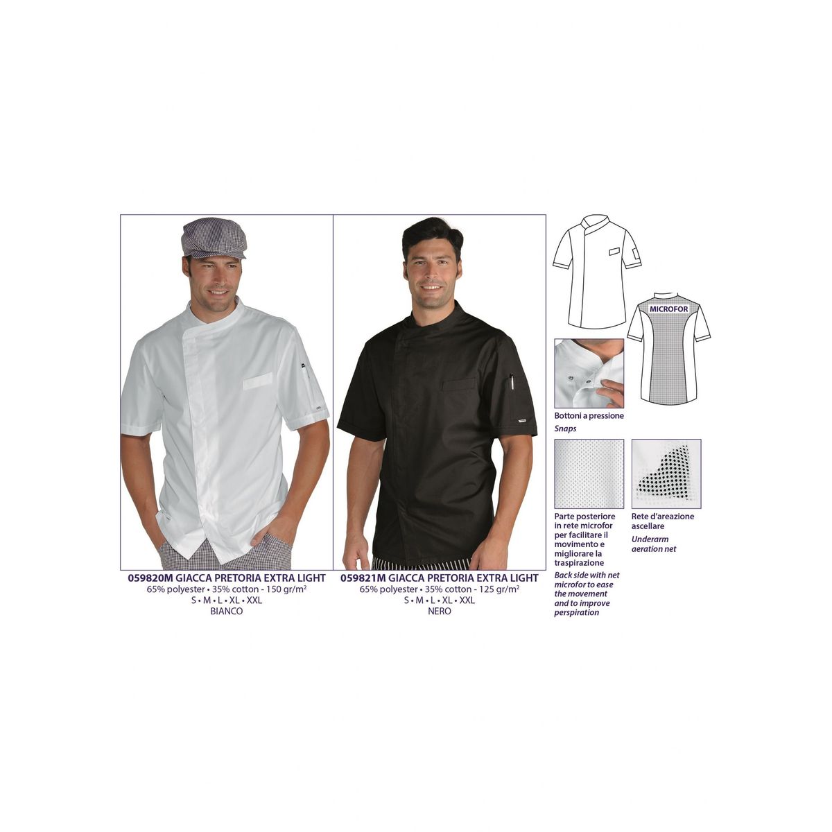 Giacca cuoco Pretoria Extralight, modello classico con bottoni a pressione, abbottonatura laterale, collo coreana, rete di areazione ascellare, taschino petto+taschino manica sinistra, rete Microfor posteriore per una migliore traspirabilità