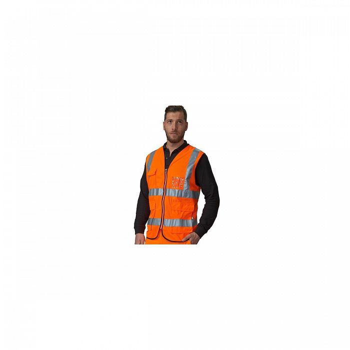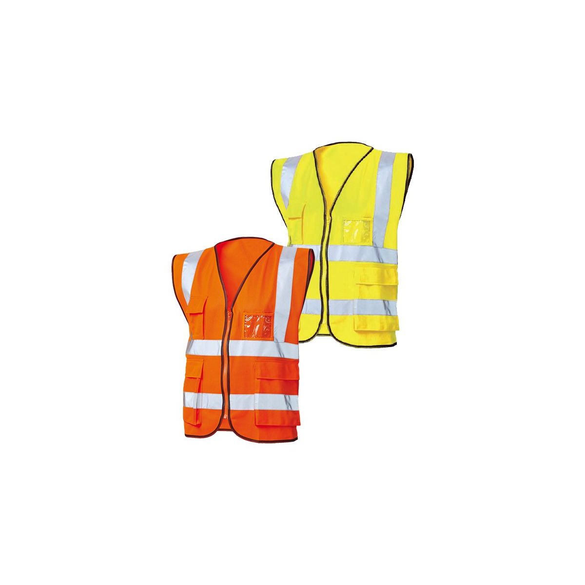 Gillet alta visibilità 100% poliestere 180gr. con bande rinfrangenti , taschino portacellulare , finestra portatessera, due tasche laterali, chiusura a cerniera UNI EN ISO 20471:2013 CLASSE 2