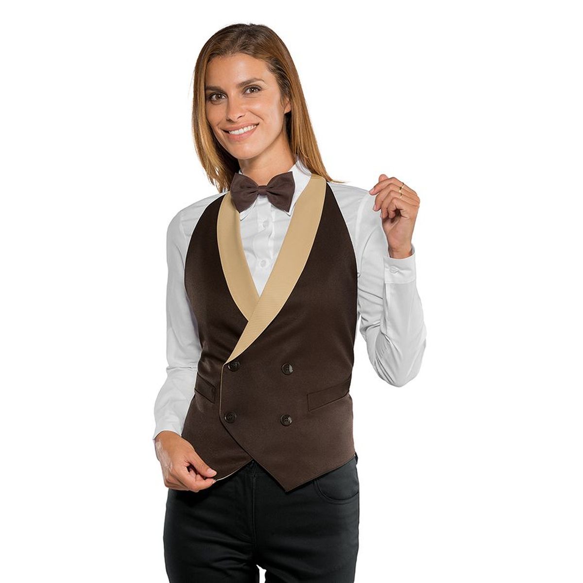 - Gilet classico da cameriere, foderato, modello unisex, - piccola martingala con fibbia posteriore per migliore regolazione e vestibilità, - abbottonatura con bottone semplice in tinta, - in tessuto antimacchia e non-stiro, poliestere 100%, peso 145 gr/mq, - colore murano 01 (sfondo nero con ro...