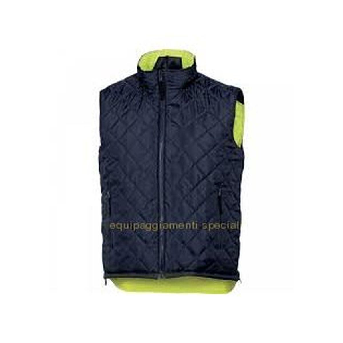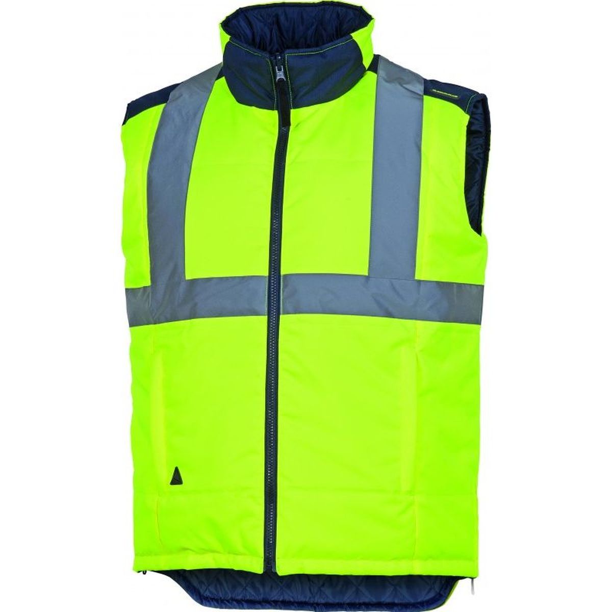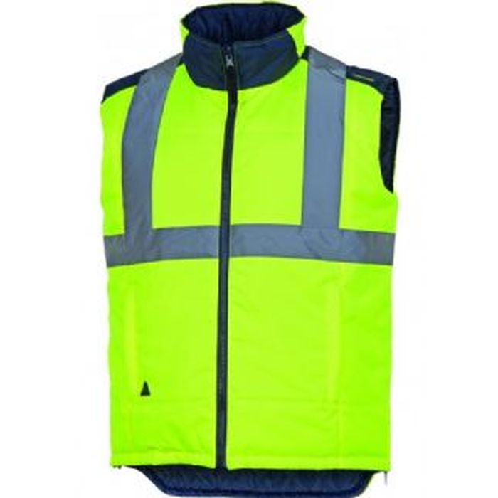 Gilet piumino reversibile. Chiusura con cerniera. 4 tasche. - Alta visibilità:Classe 2-Colore argento-Bande a bretella. 1 lato tessuto poliestere Oxford spalmato poliuretano. - 1 lato Taffetà poliestere imbottito - Bande retro-riflettenti cucite. - Colore Giallo -