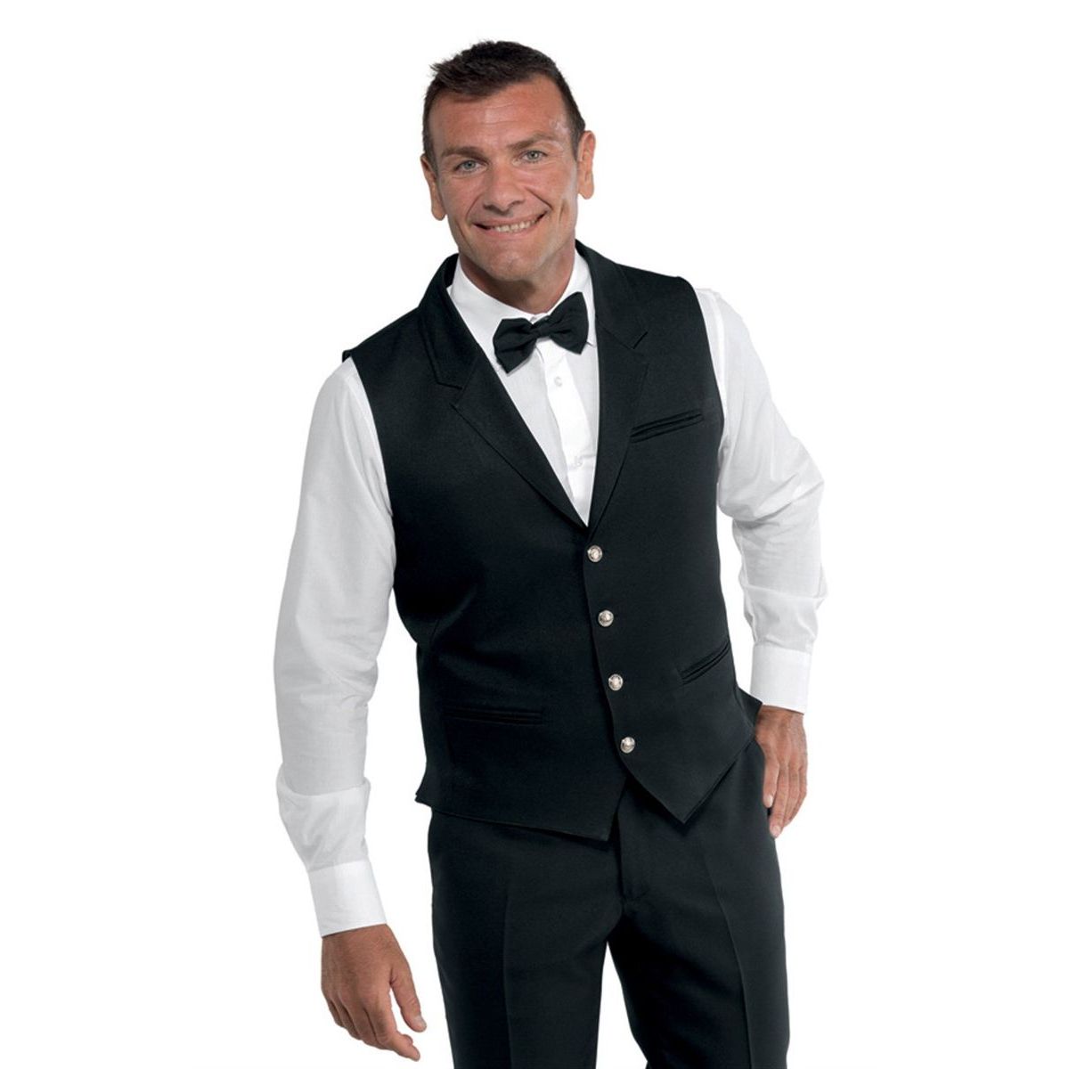 - Gilet classico da cameriere, foderato, modello unisex, - piccola martingala con fibbia posteriore per migliore regolazione e vestibilità, - abbottonatura con bottone semplice in tinta, - in tessuto antimacchia e non-stiro, poliestere 100%, peso 145 gr/mq, - colore murano 01 (sfondo nero con ro...