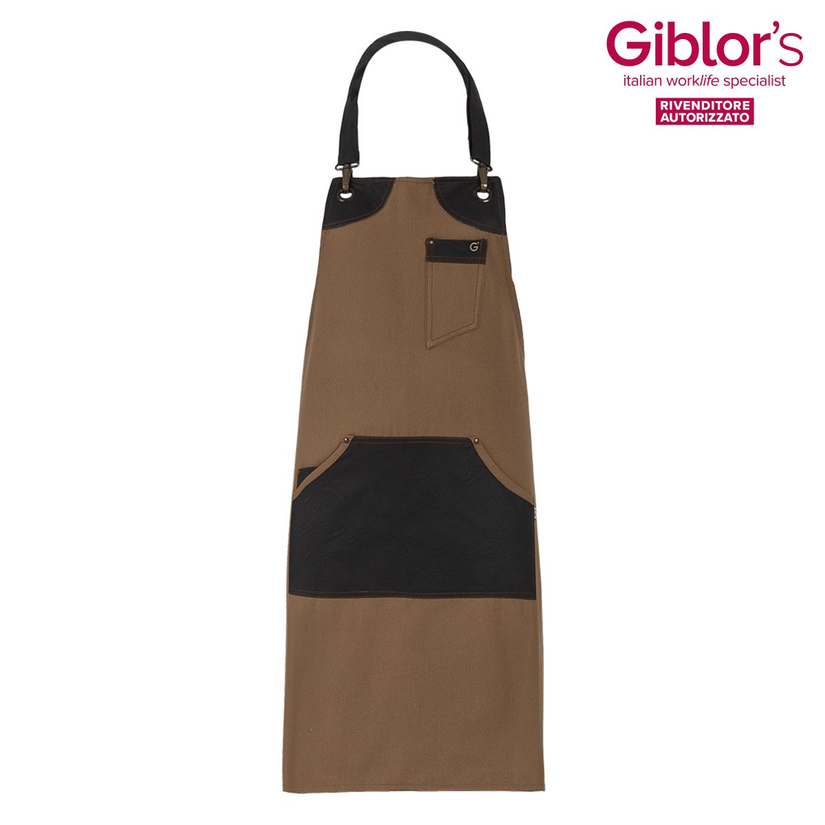 Grembiule uomo con pettorina York , due tasche, tre taschini, portapenne, allacciatura collo regolabile - - Tessuto: 55% viscosa 45% poliuretano 265 gr/m² - - Colore: marrone - - Taglia unica