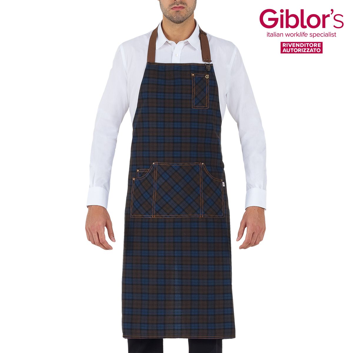 Grembiule pettorina Douglas 2 tasche, 1 taschini portapenne, allacciatura collo regolabile - Tessuto e colore:SCOZZESE MARRONE - 68% poliestere 30% viscosa 2%elastan 175 gr/m²BLU JEANS - 100% cotone 260 gr/m² - Taglia unica