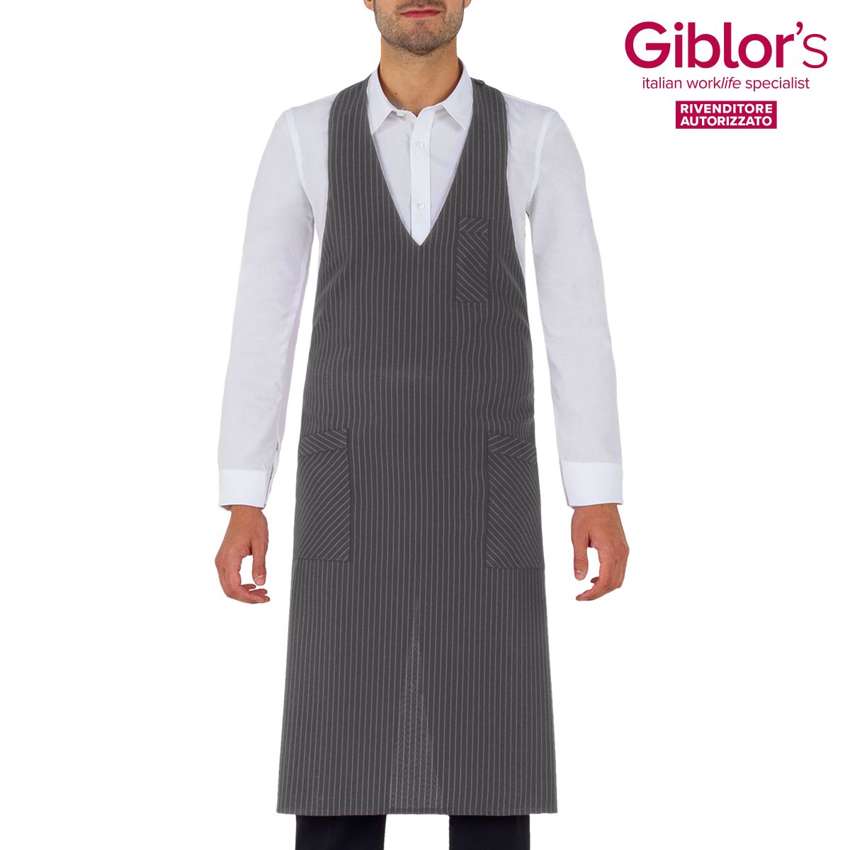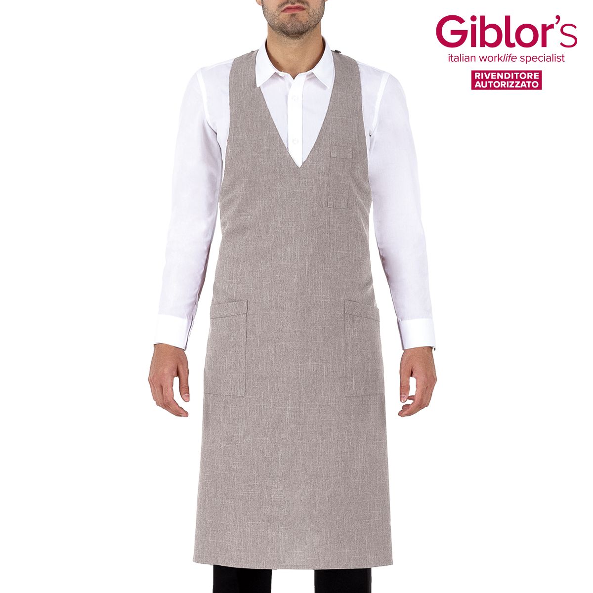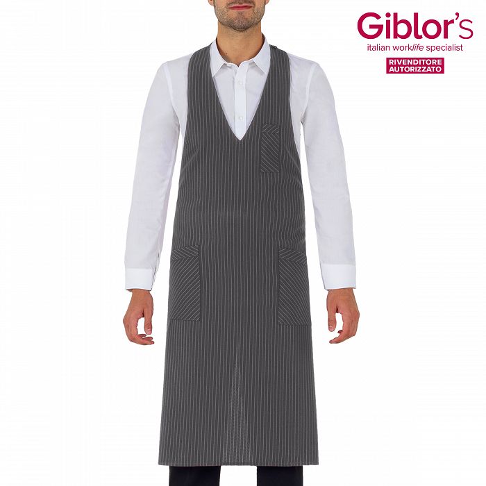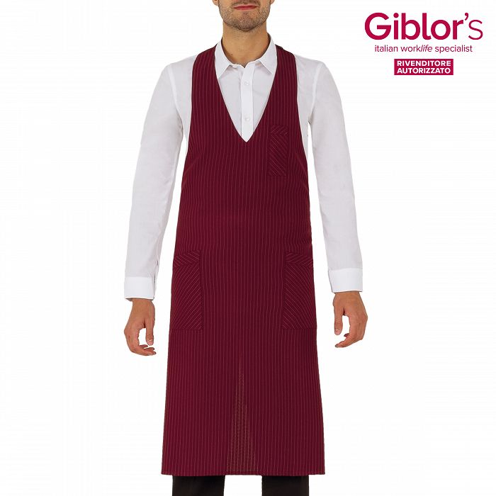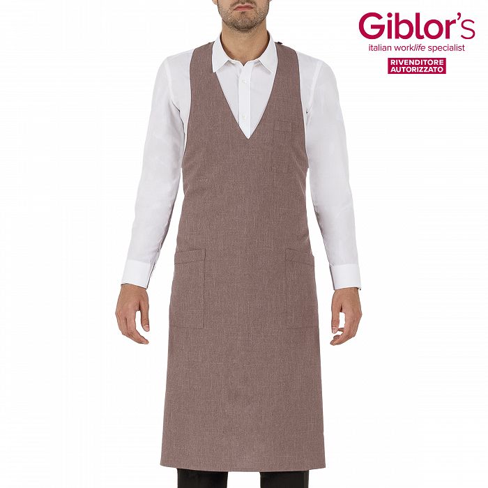 Grembiule pettorina Reno, due tasche e taschino portapenne, allacciatura al collo regolabile con bottoni - Tessuto e colore:gessato grigio, nero, bordeaux - 99% poliestere 1%viscosa, 170 gr/m² - marrone, beige, grigio - 100% poliestere, 170 gr/m² - Taglia unica