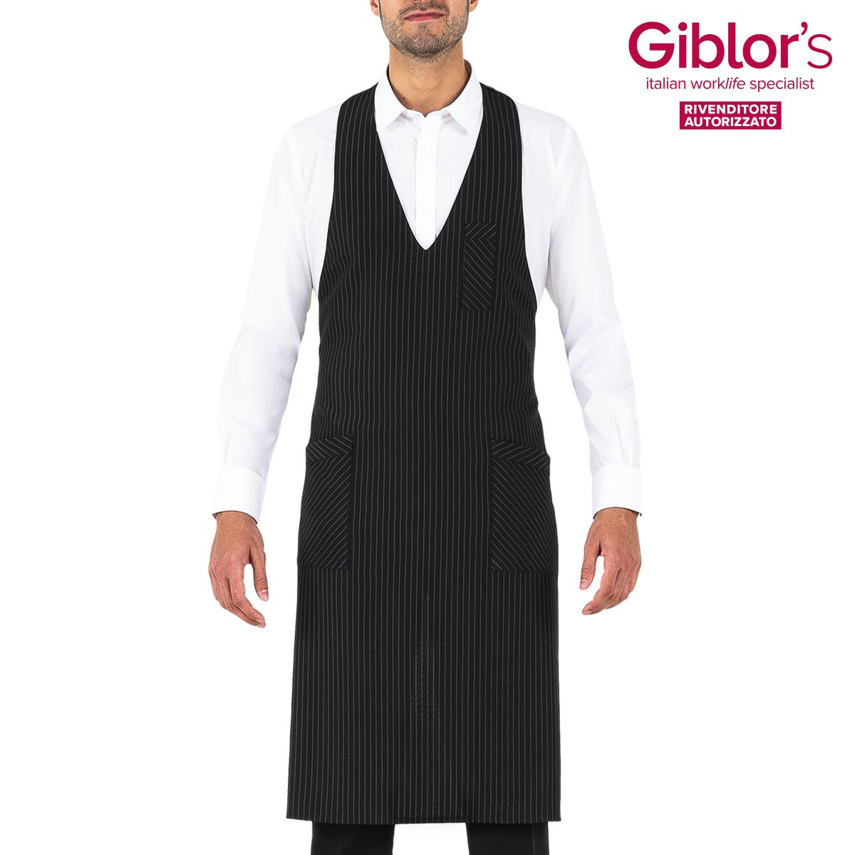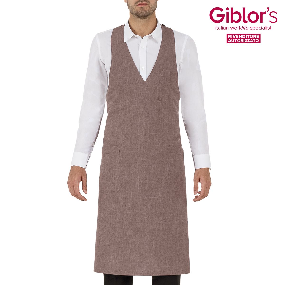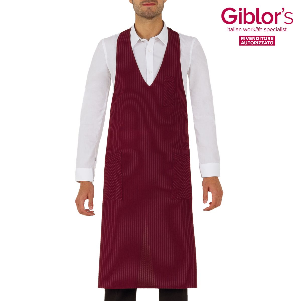 Grembiule pettorina Reno, due tasche e taschino portapenne, allacciatura al collo regolabile con bottoni - Tessuto e colore:gessato grigio, nero, bordeaux - 99% poliestere 1%viscosa, 170 gr/m² - marrone, beige, grigio - 100% poliestere, 170 gr/m² - Taglia unica