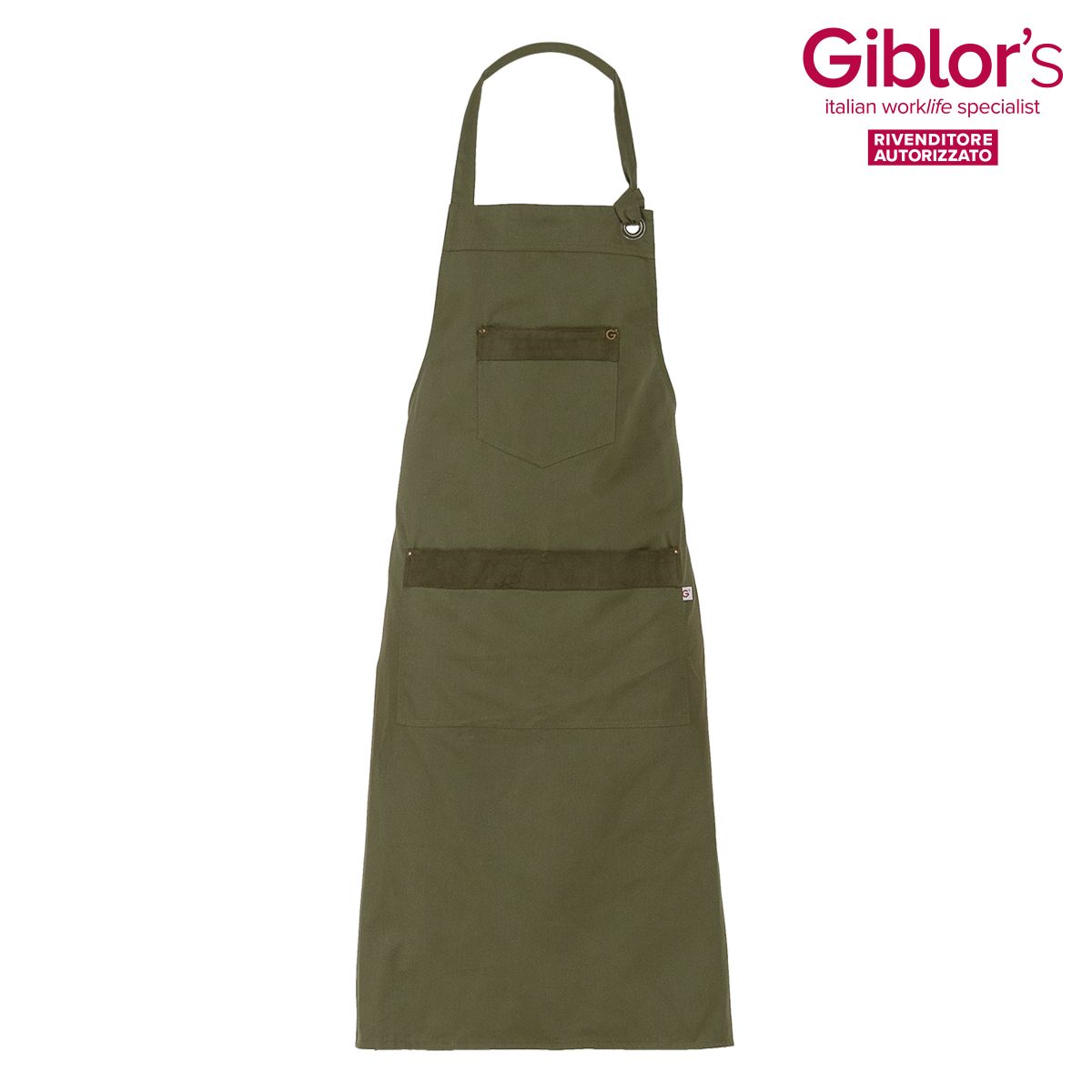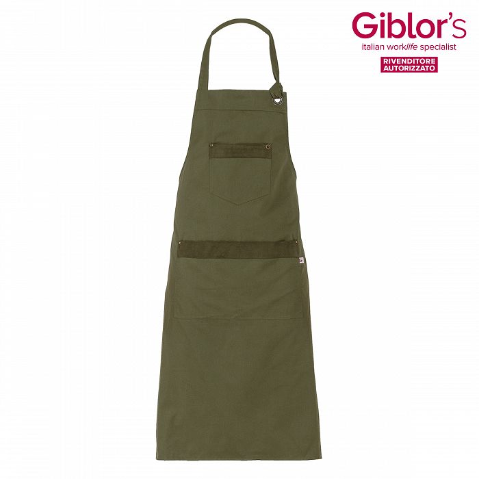 Grembiule pettorina Ryan, 3 tasche, allacciatura al collo regolabile, inserti in alcantara - Tessuto e colore:verde militare, nero - 65% poliestere 35% cotone, 200 gr/m² - Taglia unica