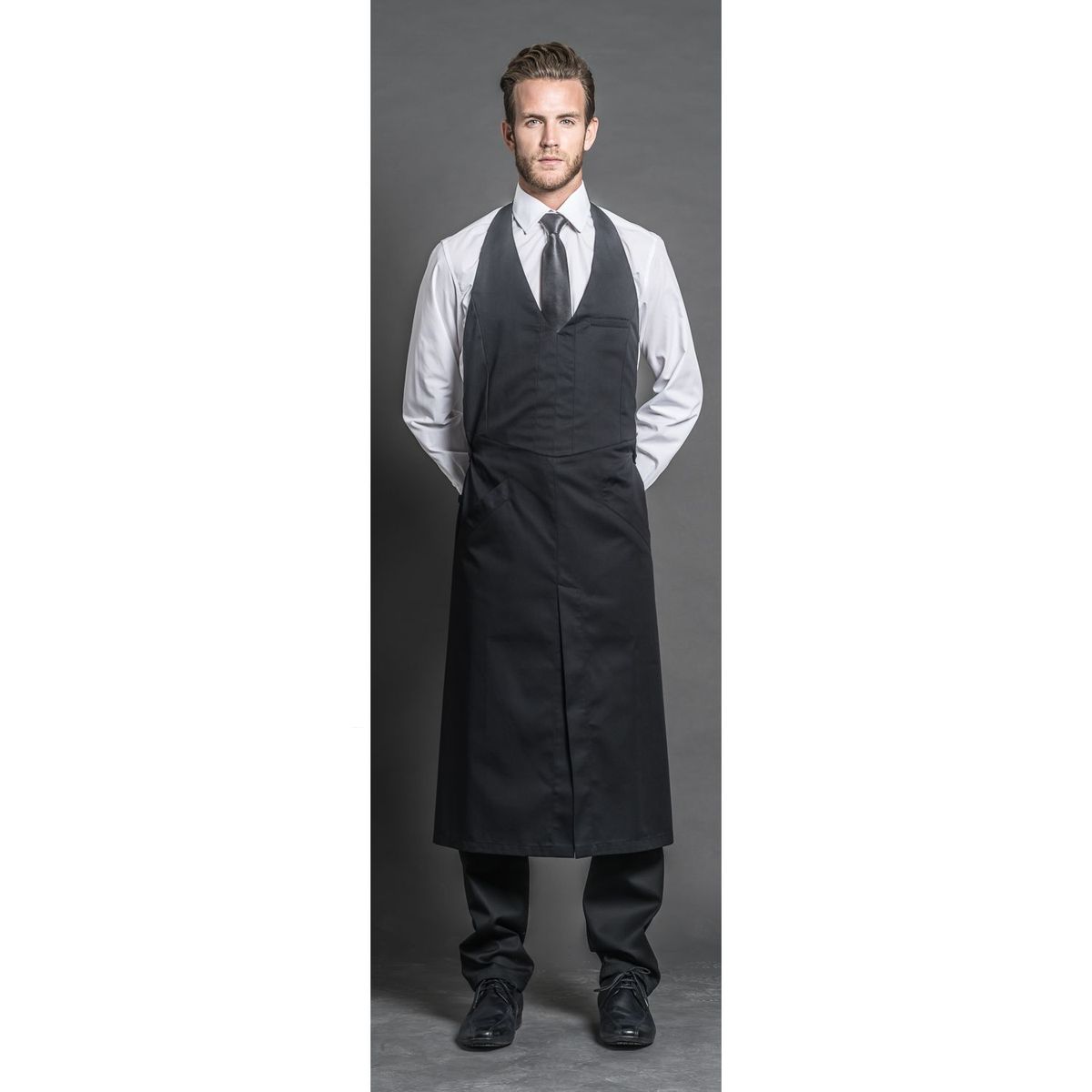 Grembiule uomo da sommellier con pettorina. Chiusura regolabile in vita con bottoni. Due grandi tasche a filetto sul davanti. Passante per canovaccio su lato destro. Collo regolabile con bottoni a pressione.