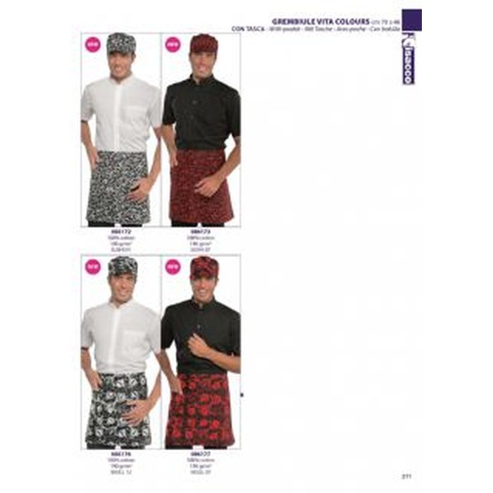 - Grembiule vita lungo, misure 92x88 cm, due ampie tasche, senza spacco. - tessuto 100% poliestere antimacchia peso da 170 a 220 gr/mq, - Taglia unica -
