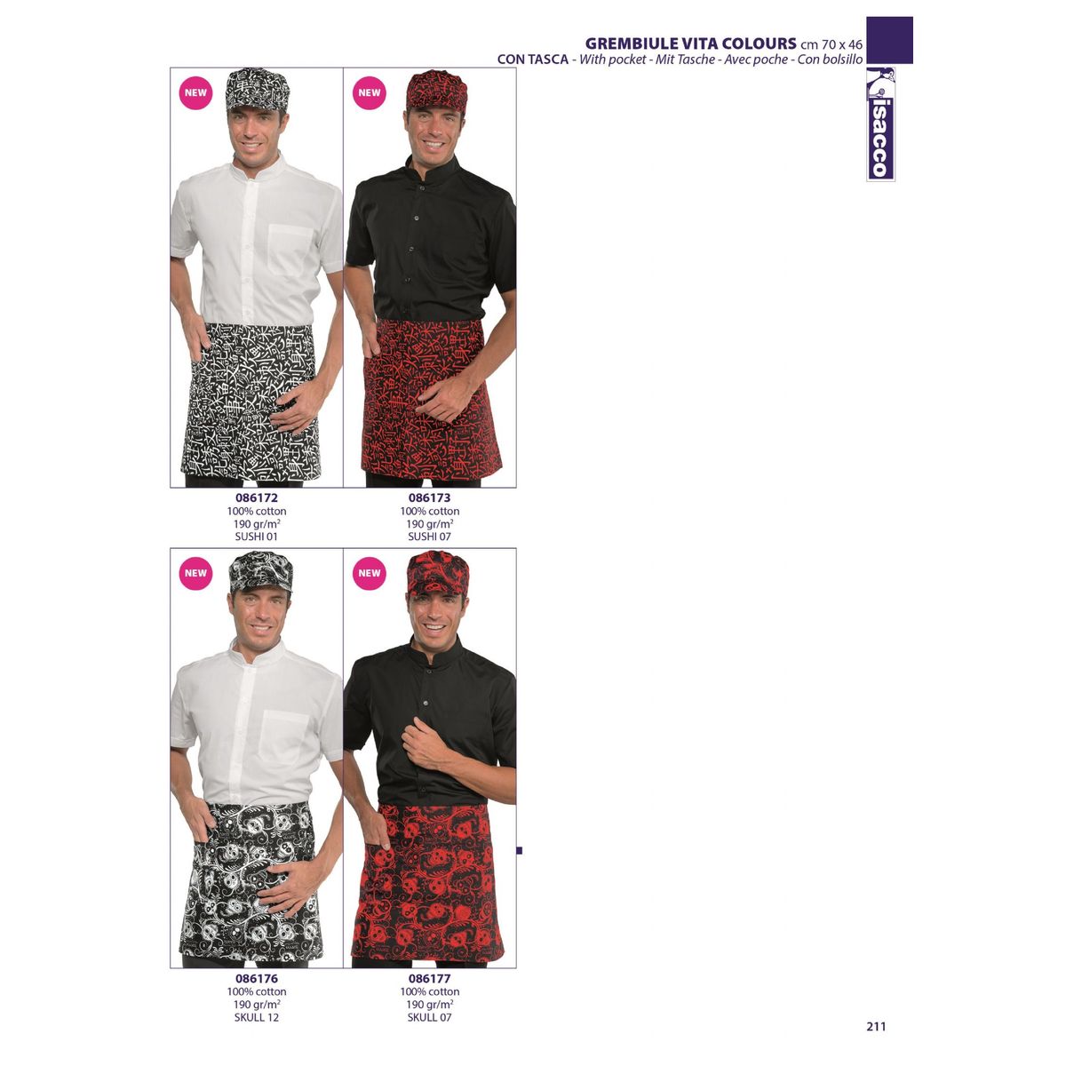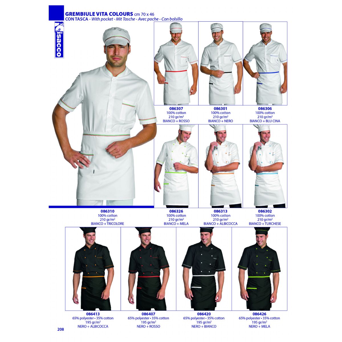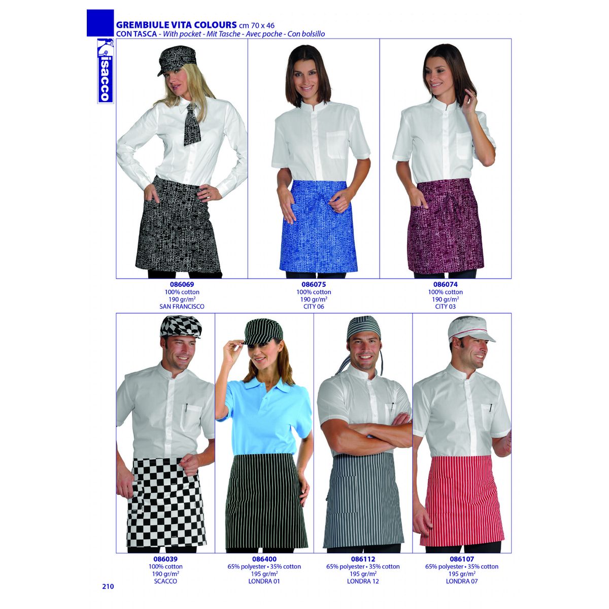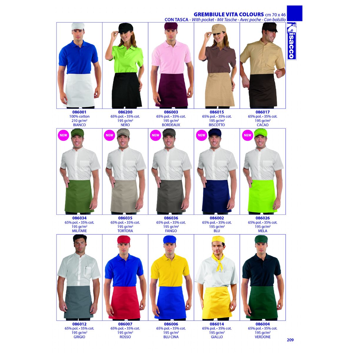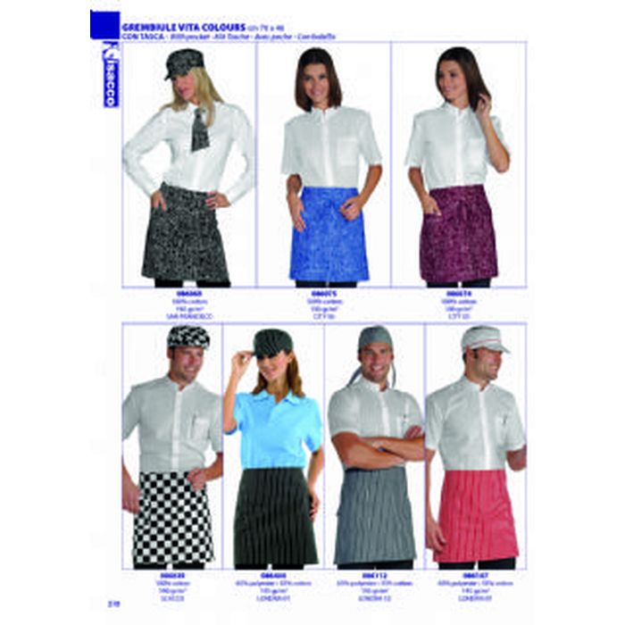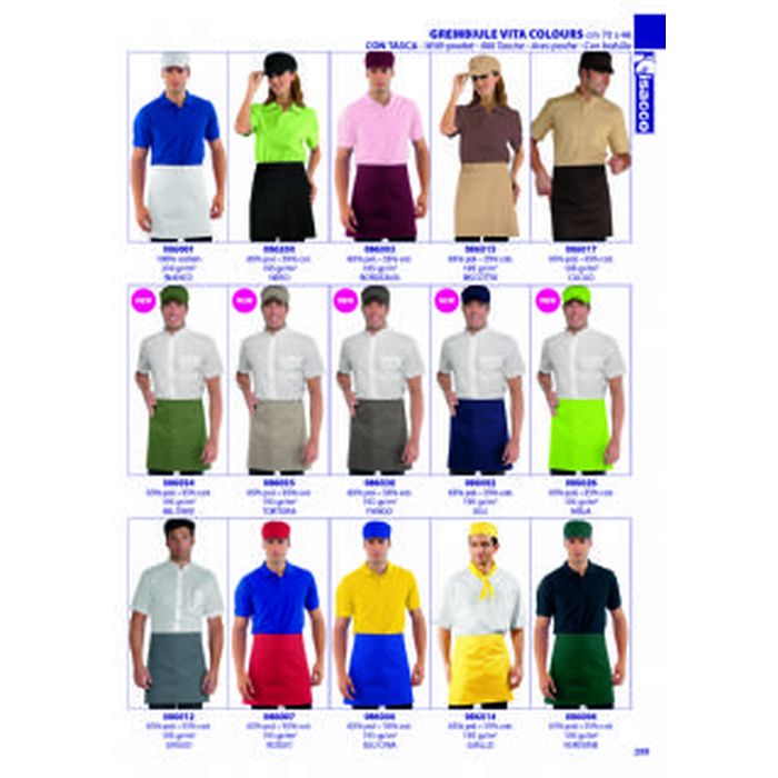 - Grembiule vita lungo, misure 92x88 cm, due ampie tasche, con spacco per facilitare la camminata. - tessuto antimacchia, 100% poliestere, peso da 170 a 220 gr/mq - Taglia unica -