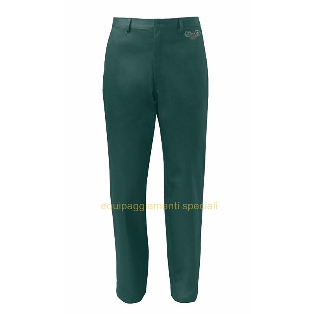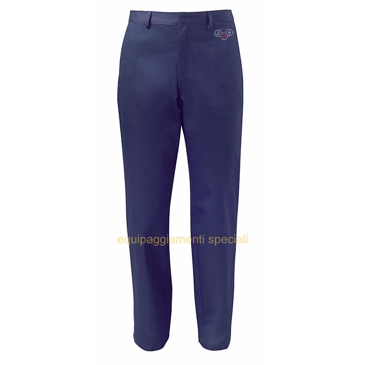 chiusura con zip e bottoni a pressione nascosti, tasca sul petto e tasca posteriore chiuse da bottoni a pressione, dettaglio normative di riferimento in transfer termosaldato, elastico in vita posteriore